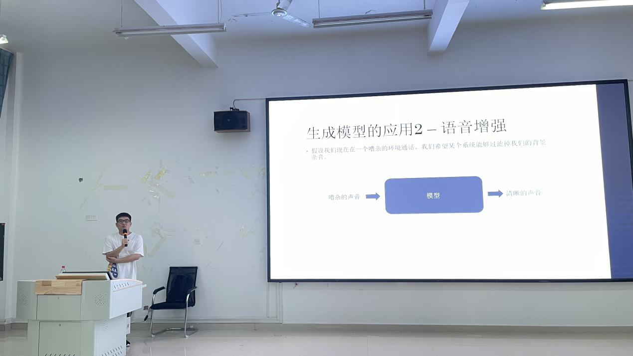 讲座伊始,程峻峰博士通过介绍对比机器学习领域中两个重要的概念:监督学习和无监督学习,引出了生成式模型的概念、特点,引起了听众的浓厚兴趣。随后,程峻峰从生成式模型的应用:图像生成、语音增强、音频生成、text to speech、点云生成等五个方面入手,通过生成物展示、绘制模型结构图、基于任务的演示等方式,向听众展示了生成式模型在多个领域中的广泛应用,这些应用场景的出现将极大地提高人们的生活和工作效率。