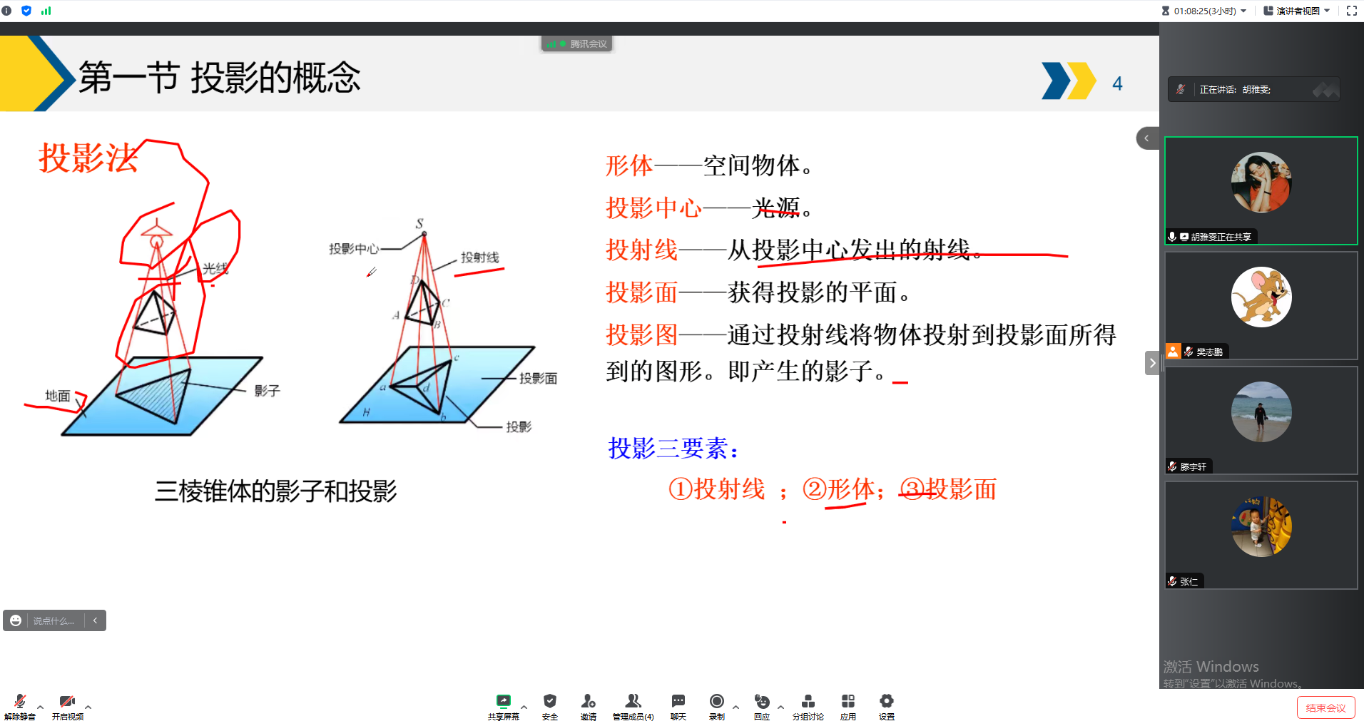 胡雅雯老师以人站在太阳下的影子为切入点,讨论了光源形式、照射角度等发生改变时影子的变化。课件展示丰富的形体投影图,将复杂的投影知识点图像化,教学效果良好。