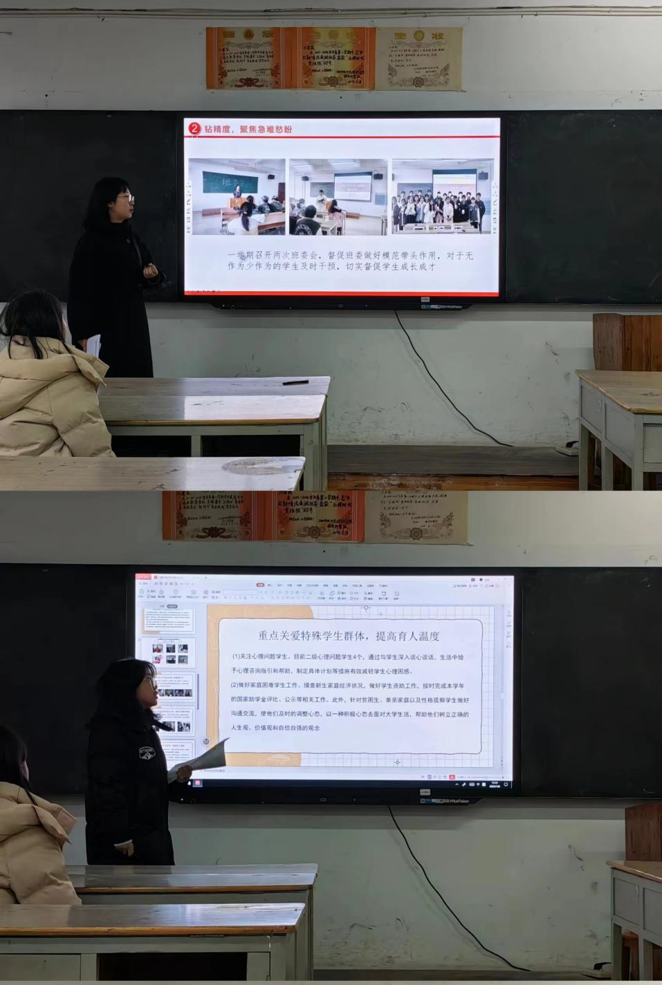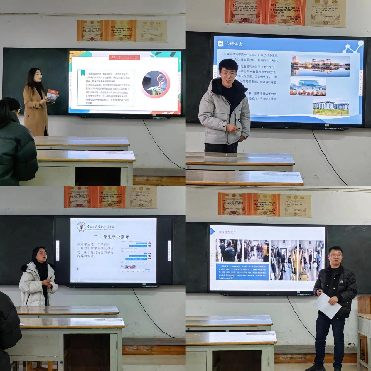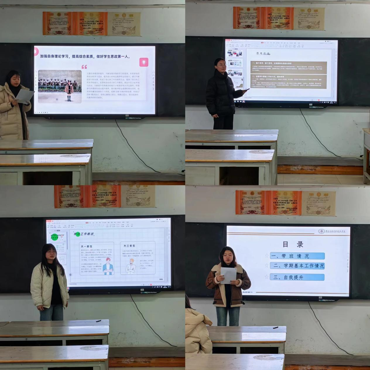 会议中,每位班主任和辅导员依次对本年度的带班工作进行述职。老师们通过阐述本年度带班班级的工作内容和工作方式,并在此基础上进行了总结反思,提炼经验。