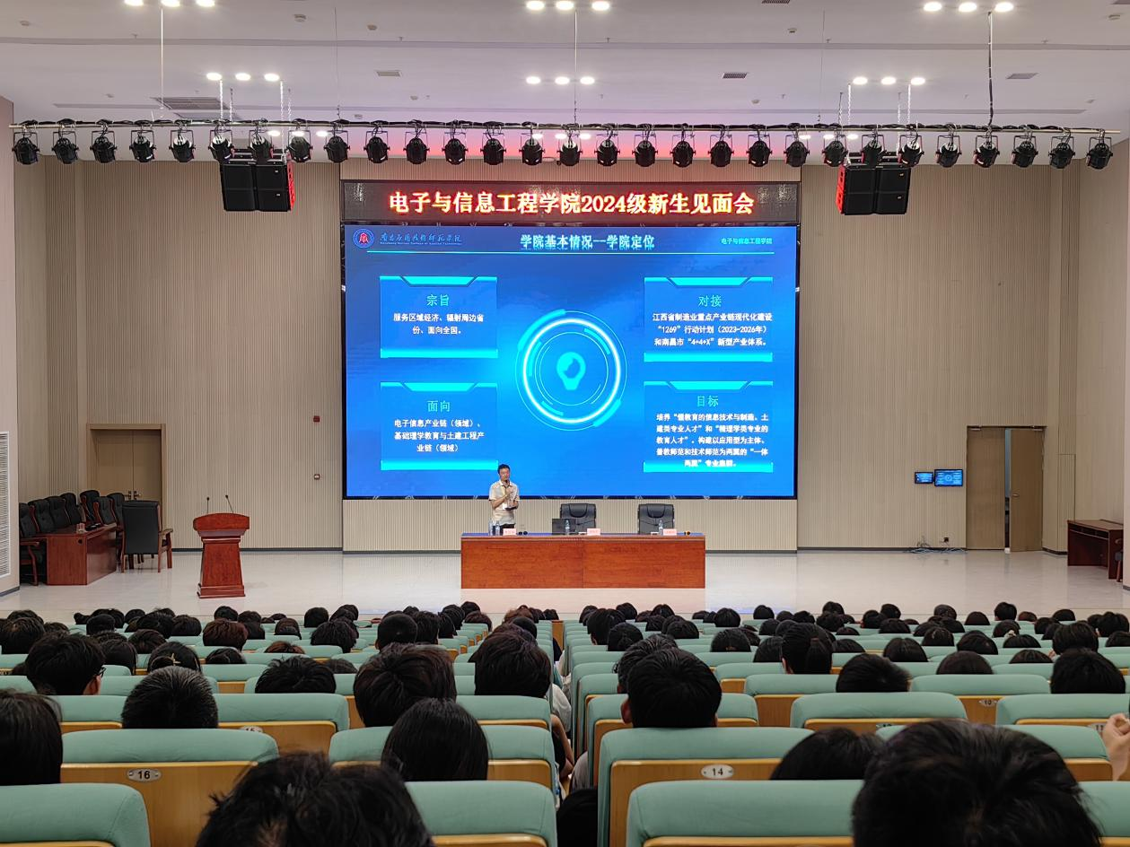 为引导新生快速适应校园生活,增强自我认知与责任感,遵守校规校纪,树牢校园安全意识,电子与信息工程学院于9月3日在图书馆报告厅召开2024级新生入学教育大会。院长魏艳平、党总支书记江建华出席本次大会,会议由党总支副书记黄金标主持,2024级全体新生参与会议。