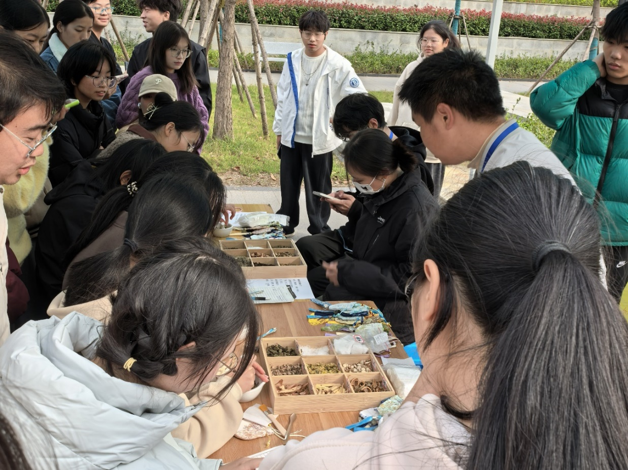 “红罗复斗帐,四角锤香囊”。活动现场,工作人员放置好各种香料,如佩兰、藿香、丁香、冰片等中药香料,为同学们准备的香囊包各个都小巧精致透露着深深的文化底蕴,并贴心为同学们准备了不同功效香囊的配方。在活动现场,同学们有序排队制作香囊,从选择香料,进行研磨,填充香料,每一个步骤都十分认真,工作人员也及时提供帮助,由同学们亲手制作的香囊通过巧妙的搭配,香气扑鼻而来,弥漫在空气中,同时更是传递了同学们的美好祝福,活动现场气氛十分融洽。