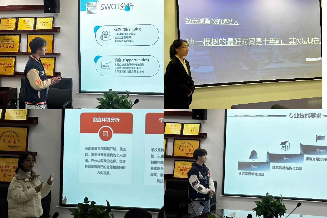 此次比赛分设有成长、就业以及短视频三个赛道,比赛吸引了众多院内学生的踊跃参与。比赛分为个人展示和现场答辩两个环节,成长赛道选手从职业目标、行动成果和目标契合度三个方面分别分享了自己的生涯发展报告;短视频赛道选手充分的利用短视频和视频文字说明来分享自己的人生规划。比赛现场,选手们从自我认知、职业环境分析、职业目标确定、评估与调整等方面,全面展示自己的职业规划。