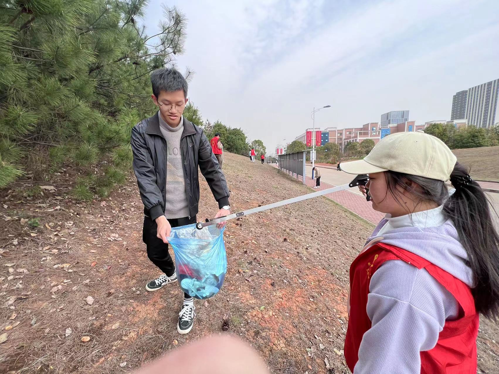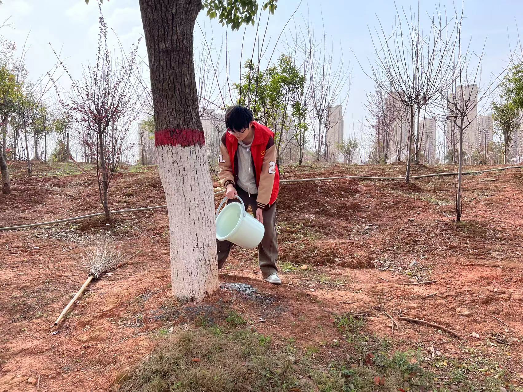 吃过午饭后,志愿者们就穿上红衣的马甲,一手拎着垃圾袋工一手拿着垃圾夹,沿着弄堂小路认真地捡拾学生丢弃的碎纸屑、烟蒂、生活垃圾等。大家的眼睛专注地盯着地面,搜寻着可以捡拾的垃圾,不放过任何一个角落。绕着道路走一圈,每个人的手中都已“战果累累”。路面上、花坛边的弃物被拾捡得干干净净,学校面貌焕然一新。之后便展开了浇水活动。本次浇水活动旨在倡导同学们提高环保意识,从爱树护木的行动做起,养成主动劳动、坚持劳动的良好习惯,为建设绿色校园贡献一份力量。同学们手拿水桶、水瓢等工具,在教学楼前集合,进行分工后,在赵威老师的带领下,同学们便撸起袖子开始了浇水劳作。 同学们分组协作,进行取水、浇灌树木等工作。在劳动中成员们积极发扬团队合作精神,不断强化正确劳动观。